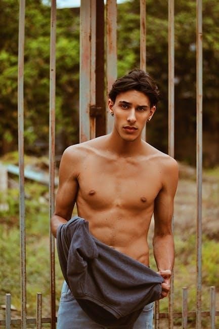 The Nick Bare Fitness Program is divided into a 12-week structured plan, focusing on progressive development. Weeks 1-4 emphasize foundation building, with workouts targeting push, pull, and lower body exercises. Weeks 5-8 introduce progressive overload, increasing intensity and challenging the body further. The final weeks (9-12) focus on peak performance, incorporating advanced techniques and maximizing results. Each phase is designed to build on the previous one, ensuring continuous improvement and adaptation. The program also includes cardio sessions and nutritional advice to support overall progress, making it a well-rounded approach to achieving fitness goals.