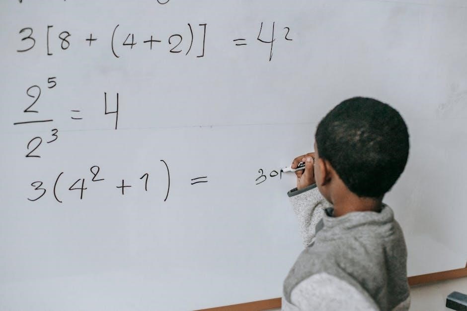 Multiplication and division equations introduce students to solving for variables using inverse operations. For example, equations like 4x = 12 or y ÷ 5 = 3 require dividing or multiplying both sides to isolate the variable. These equations build on addition and subtraction skills, teaching students to reverse multiplication and division. They are fundamental in algebra, helping students understand how to manipulate equations while maintaining balance. Mastery of these equations is crucial for advancing to more complex algebraic problems. Visual aids, like arrays for multiplication, can help students grasp these concepts more effectively.